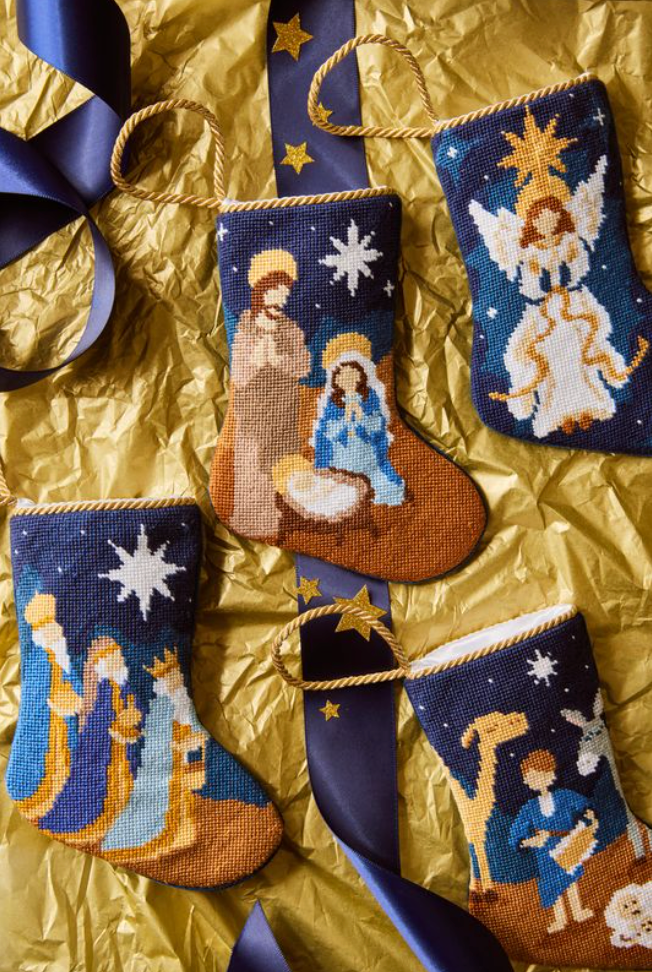 The story that started it all — hand-stitched in timeless detail. The Nativity: Jesus, Mary, and Joseph Bauble Stocking captures the holy night in heirloom-quality needlepoint. A keepsake made to honor the spirit of the season, it’s a beautiful reminder of faith, love, and light. For those who celebrate with wonder and worship, this stocking brings reverence and tradition home to the hearth.