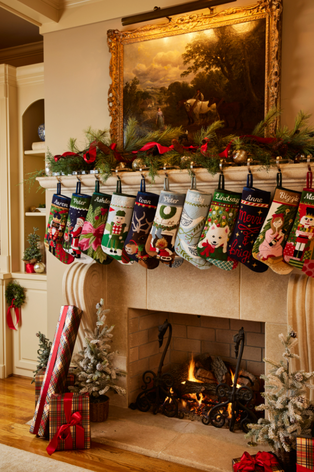 Festive mantle decorated with a Full Size Stockings, greenery, and holiday ornaments